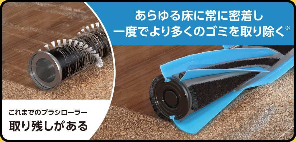 フローリングやカーペットなどあらゆる床に常に密着し、ムラなく効率よくゴミをキャッチ。従来のブラシロールでは一度で取り切れなかったゴミも、新開発のブラシレスパワーフィンならあらゆる床に密着し、大きなゴミから細かいホコリまで一度でより多くのゴミを取り除きます※。