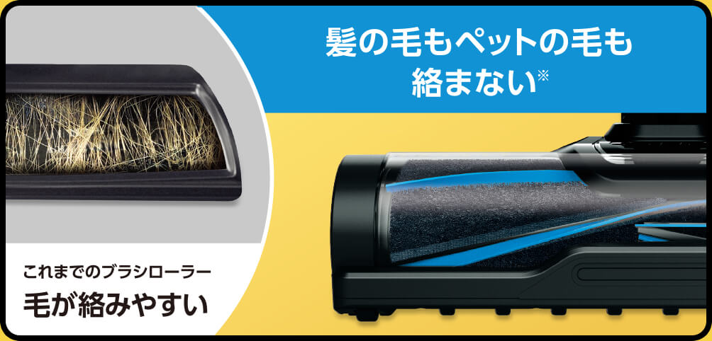 お掃除にやっかいな長い髪の毛やペットの毛。新開発のブラシレスパワーフィンは長い髪の毛もペットの毛も強力に取り除きます。従来のブラシロールではすぐに絡んでお手入れが大変だった髪の毛も、ブラシレスパワーフィンなら自分自身をお掃除するから毛が絡みません※。