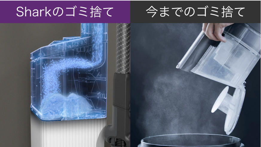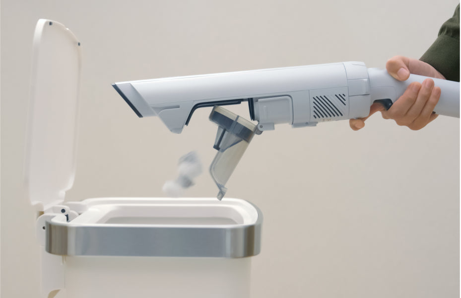 手元のボタンを引くだけでダストカップが開き、手を汚さずに、ゴミ箱に捨てることができます。