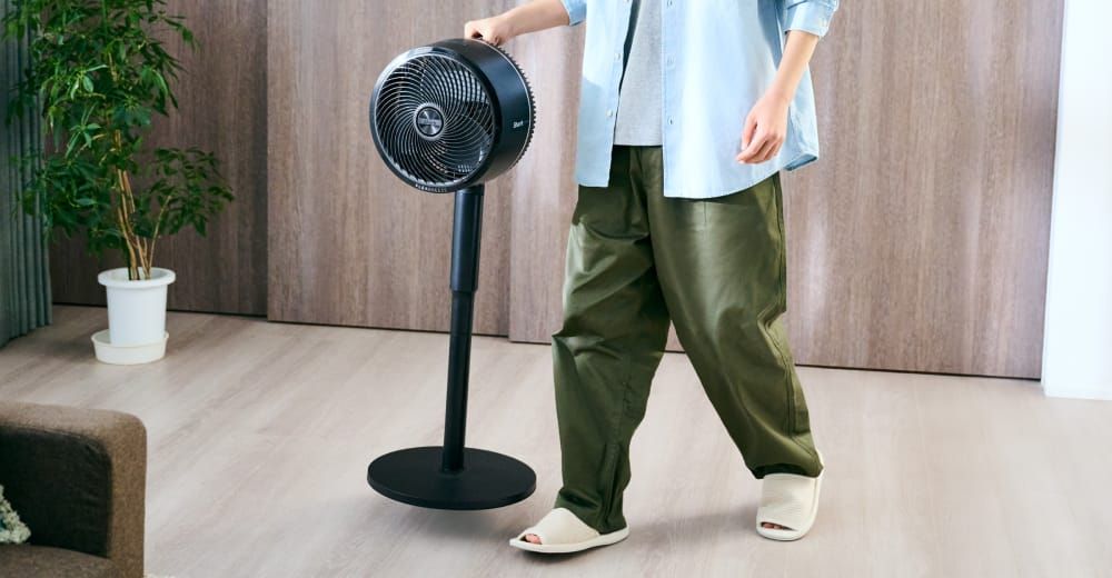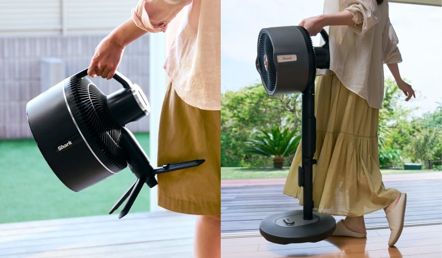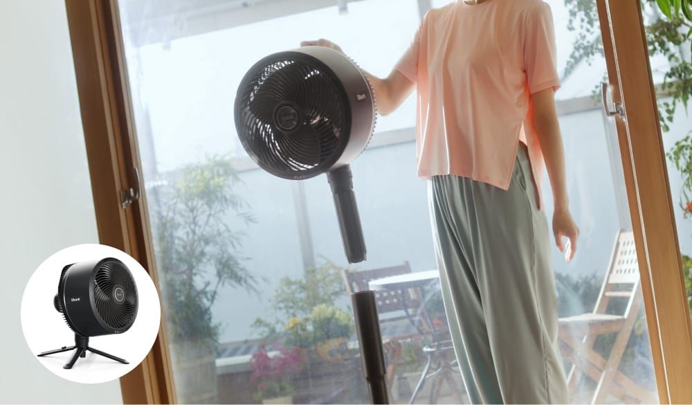 スタンドから本体をボタンを押して取り外し、四脚を開いてそのまま使えます。持ち運びに便利で、低い位置で風を送ったり机の上で使ったり、用途が格段に広がります。