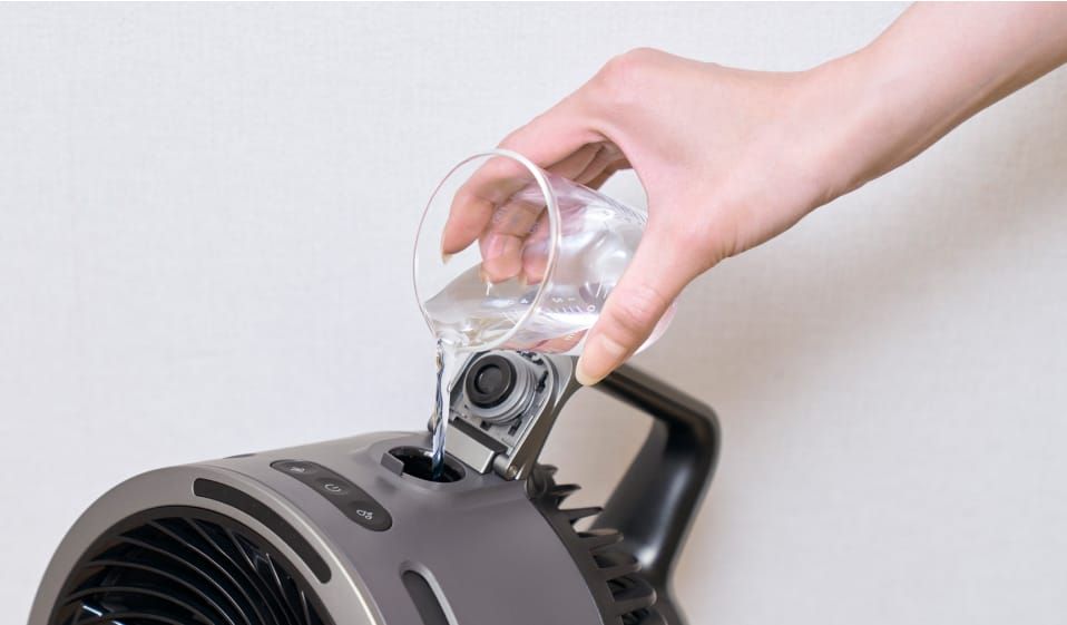 タンクは取り外しできるので、ワンタッチでスタンドから扇風機本体を取り外し、四脚を開いてそのままミストを楽しめます。
