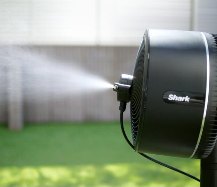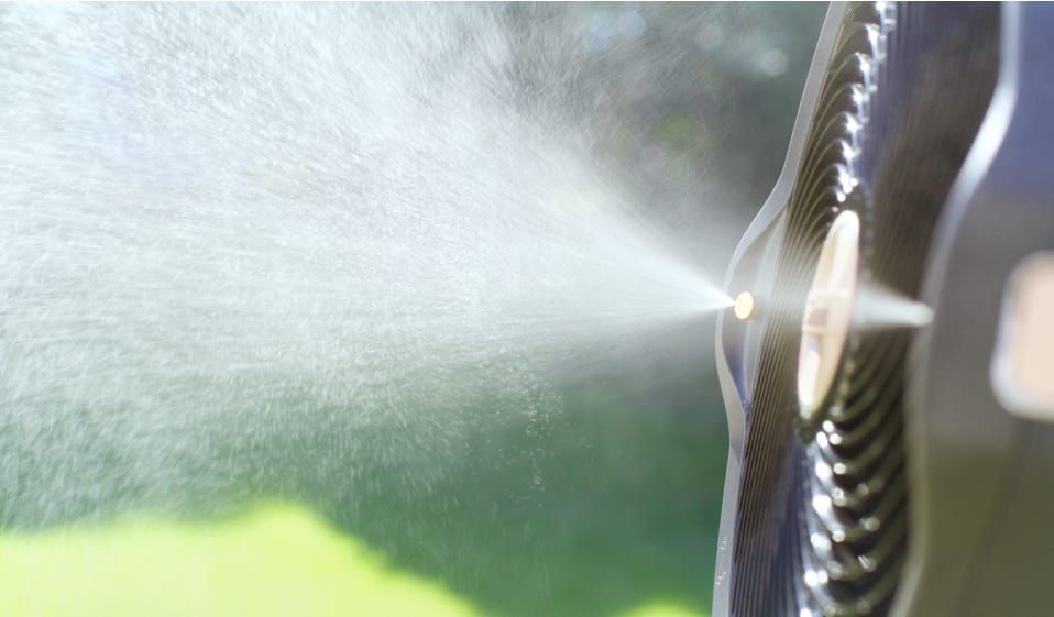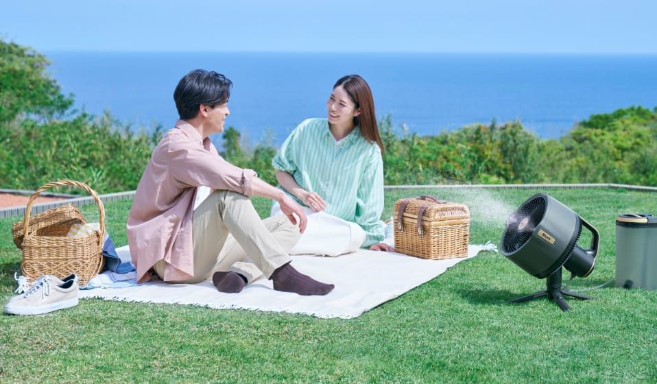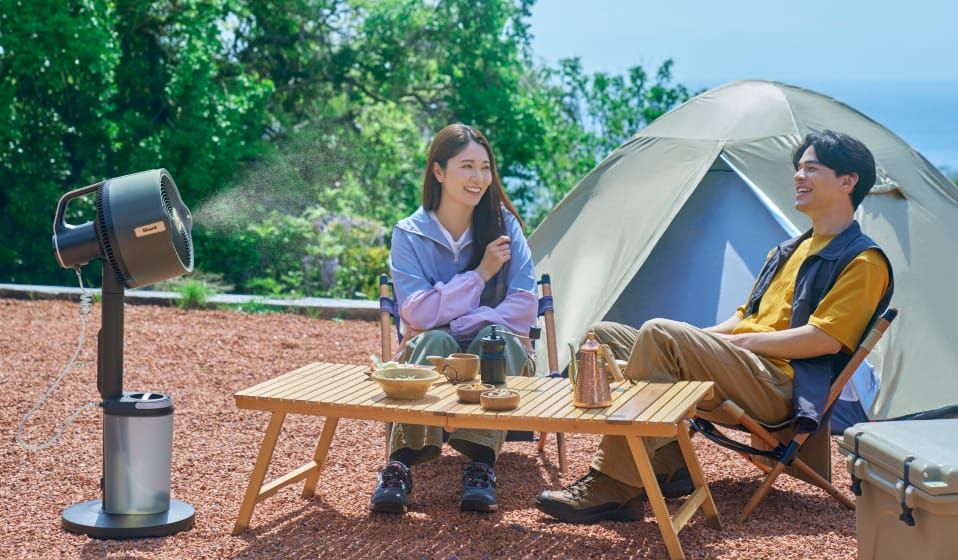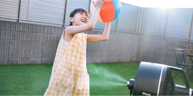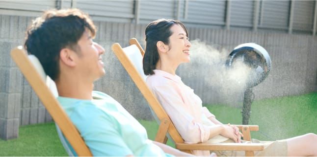細かな粒子のミストが最大3m先まで届き、温度を下げて快適空間を提供。暑い外でもミストで涼しく快適に過ごすことができます。